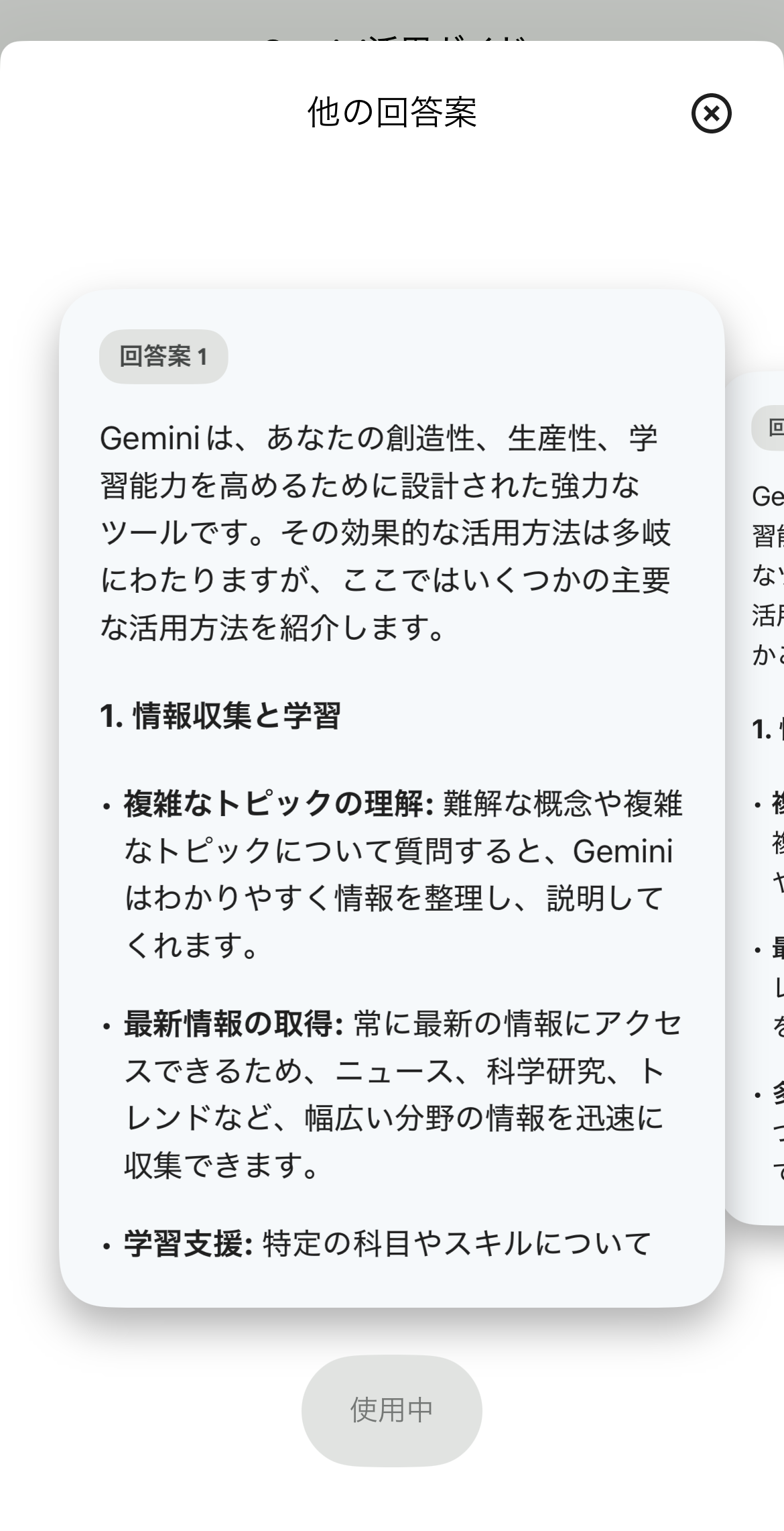 ``Gemini is convenient, but I want to adjust my answers to be more accurate.'' ``I want to change the wording, but asking a question from scratch is a hassle...'' In such cases, the ``regenerate'' and ``rewrite'' functions provided by Gemini will come in handy.