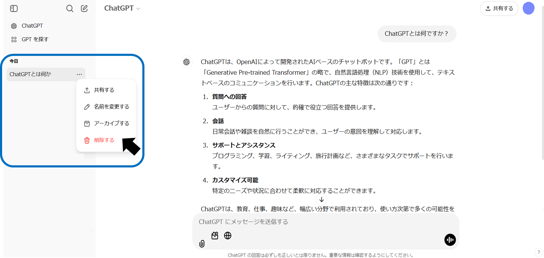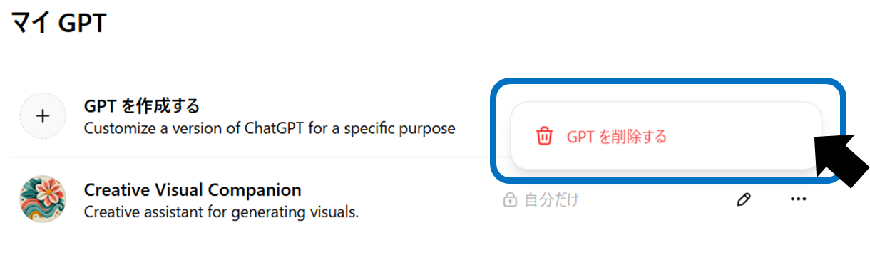 対象のGPTの「…」をクリックし、「GPTを削除する」を選択します。