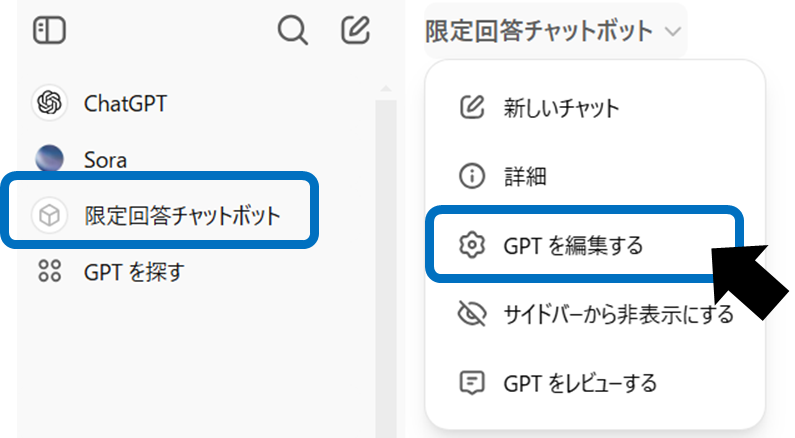 特定のファイルを削除したい場合は、該当のGPTをクリックし、「GPTを編集する」を選択します。