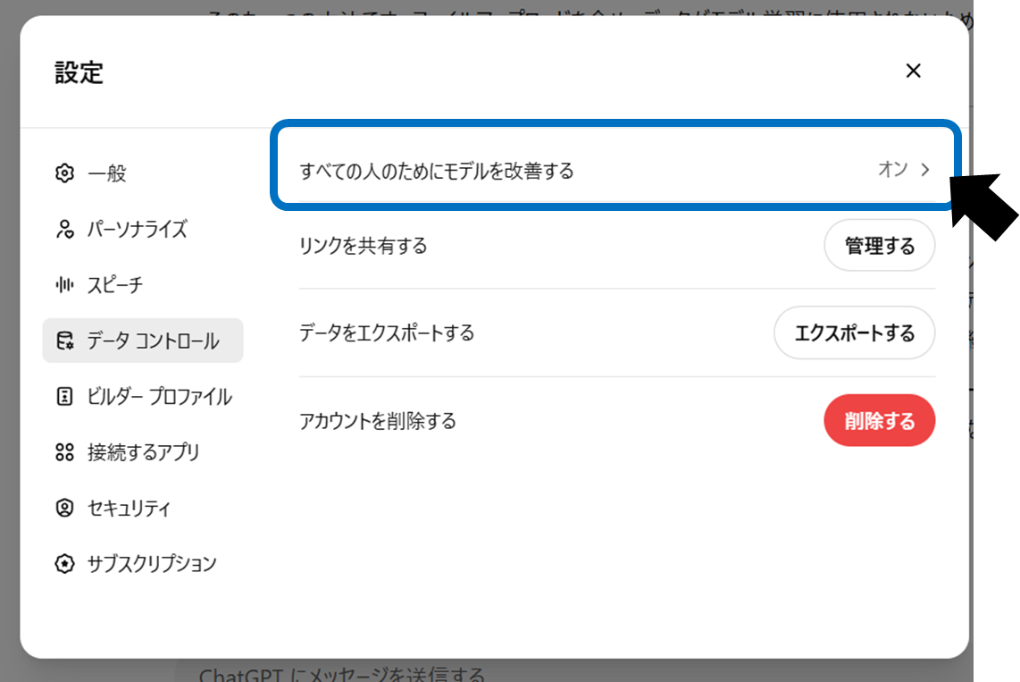 ただし、OpenAIはデータコントロール機能を通じて、ユーザーが自ら設定を管理できる仕組みを提供しています。必要に応じて、ChatGPTの設定から「モデルの学習に利用しない」ようオプトアウトすることも検討しましょう。