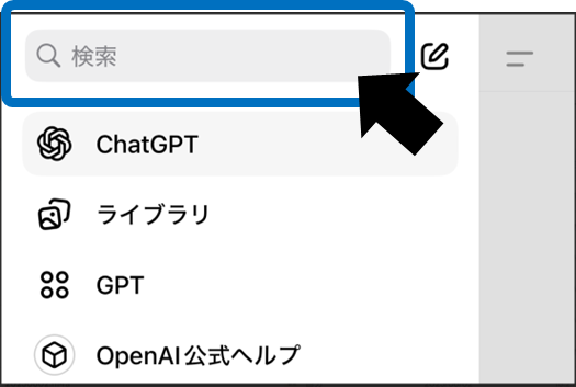 ChatGPTにログイン後、画面左側のサイドバーにある虫眼鏡アイコンをクリックします。キーボード操作の場合は Ctrl + K(Windows)/Cmd + K(Mac) でも検索バーが開きます。
