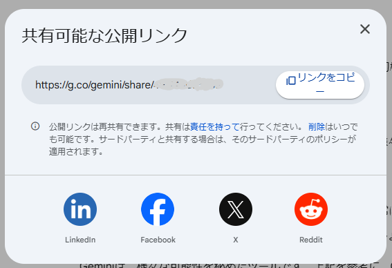 Geminiには、チャット画面そのものをURL(公開リンク)で共有できる機能があります。URLを知っている人であれば、Geminiで行った質問や回答を手軽に閲覧できるのが最大のメリットです。