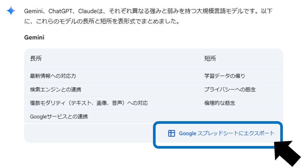 回答に表が含まれていれば、表の右下に GoogleスプレッドシートにエクスポートGoogle スプレッドシートにエクスポート ボタンが表示されます。クリックまたはタップすると、新しいスプレッドシートが生成され、表データが挿入されます。