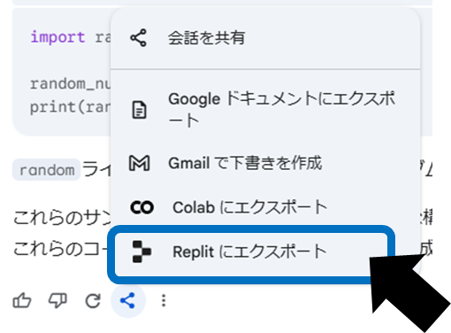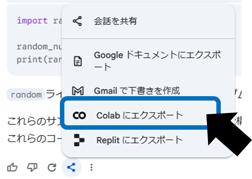 回答の下にある「共有とエクスポート」アイコンから ColabにエクスポートColab にエクスポート を選択すると、新しいColabノートブックが作成されます。ただし、Google Workspaceアカウントでは現在この機能が利用できないため、個人アカウントでの利用を検討しましょう。
