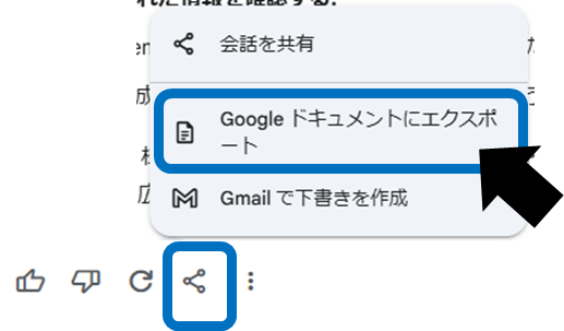回答の下にある「共有とエクスポート」アイコンを選び、「Googleドキュメントにエクスポート」をクリックします。すると、Googleドライブに新しいドキュメントが作成され、回答内容がそのまま貼り付けられます。